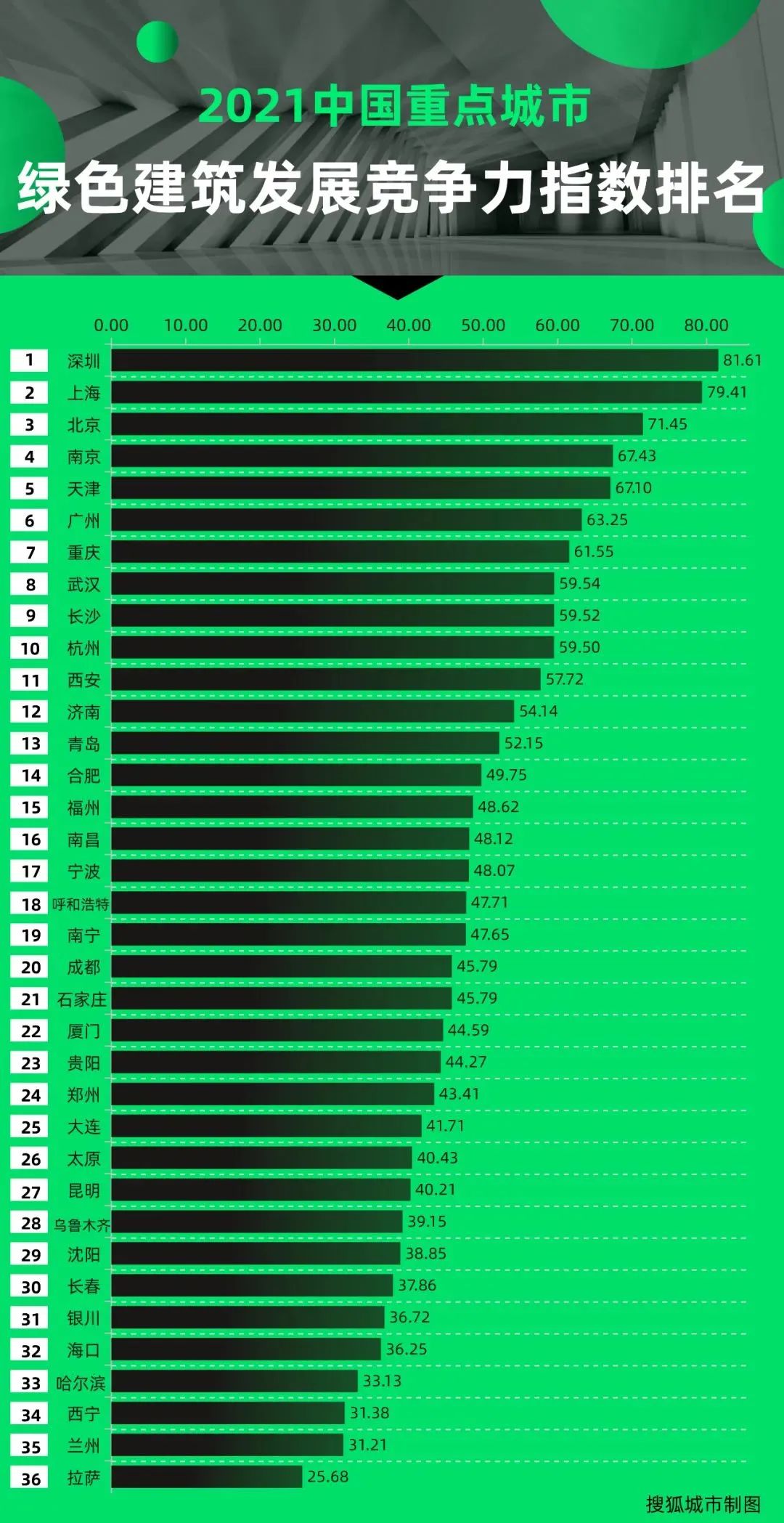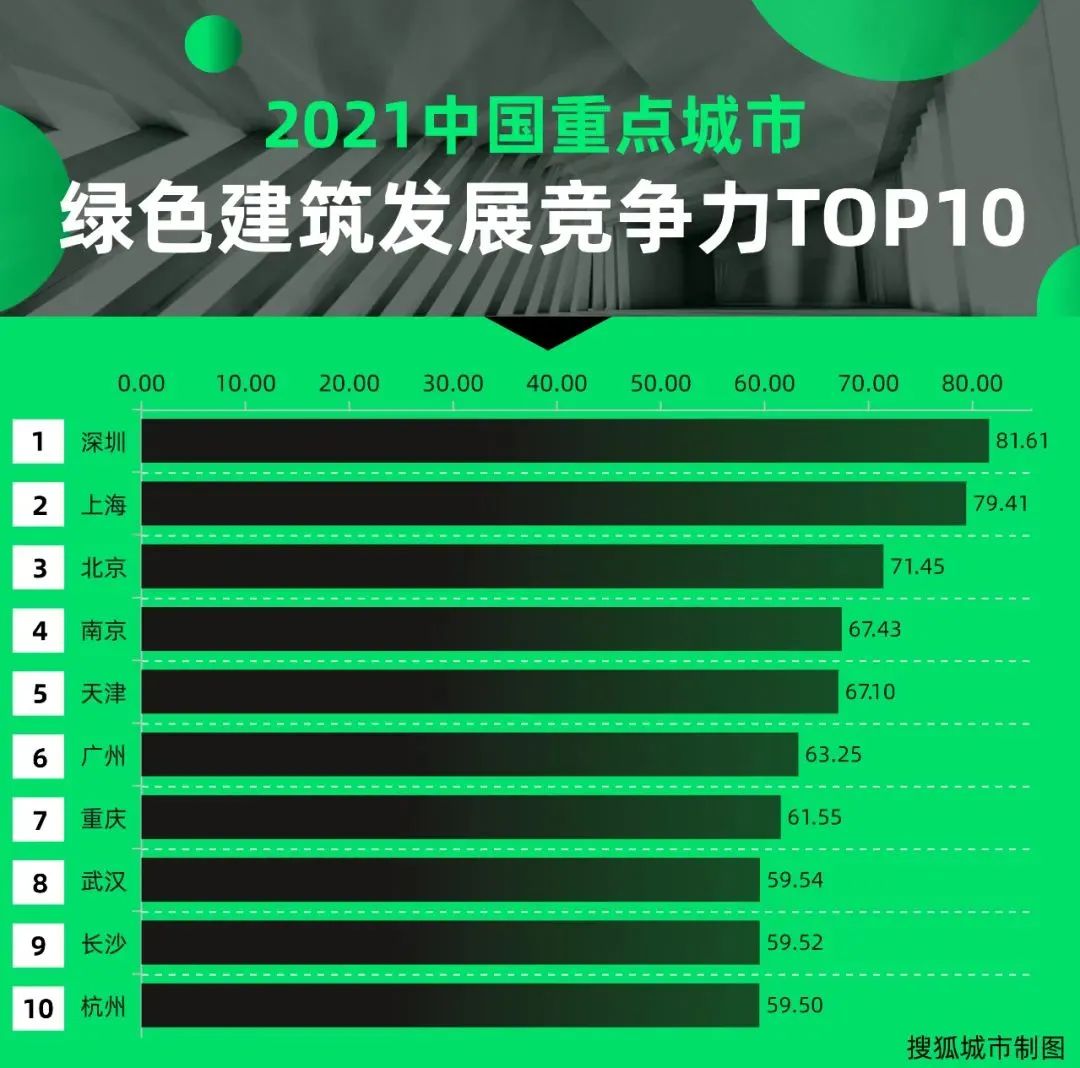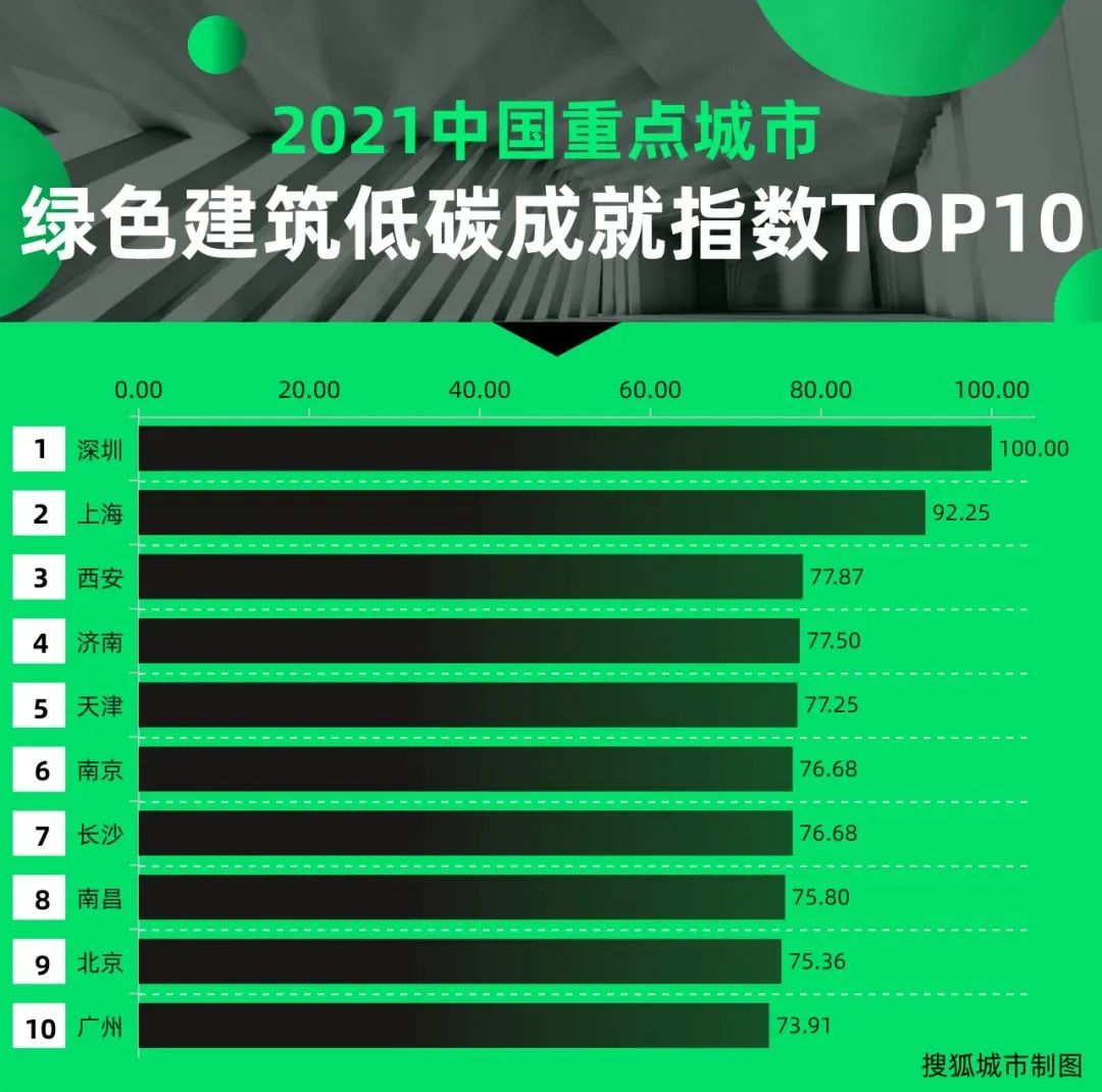 2021绿色建筑低碳成就指数十强城市依次为深圳、上海、西安、济南、天津、南京、长沙、南昌、北京和广州。