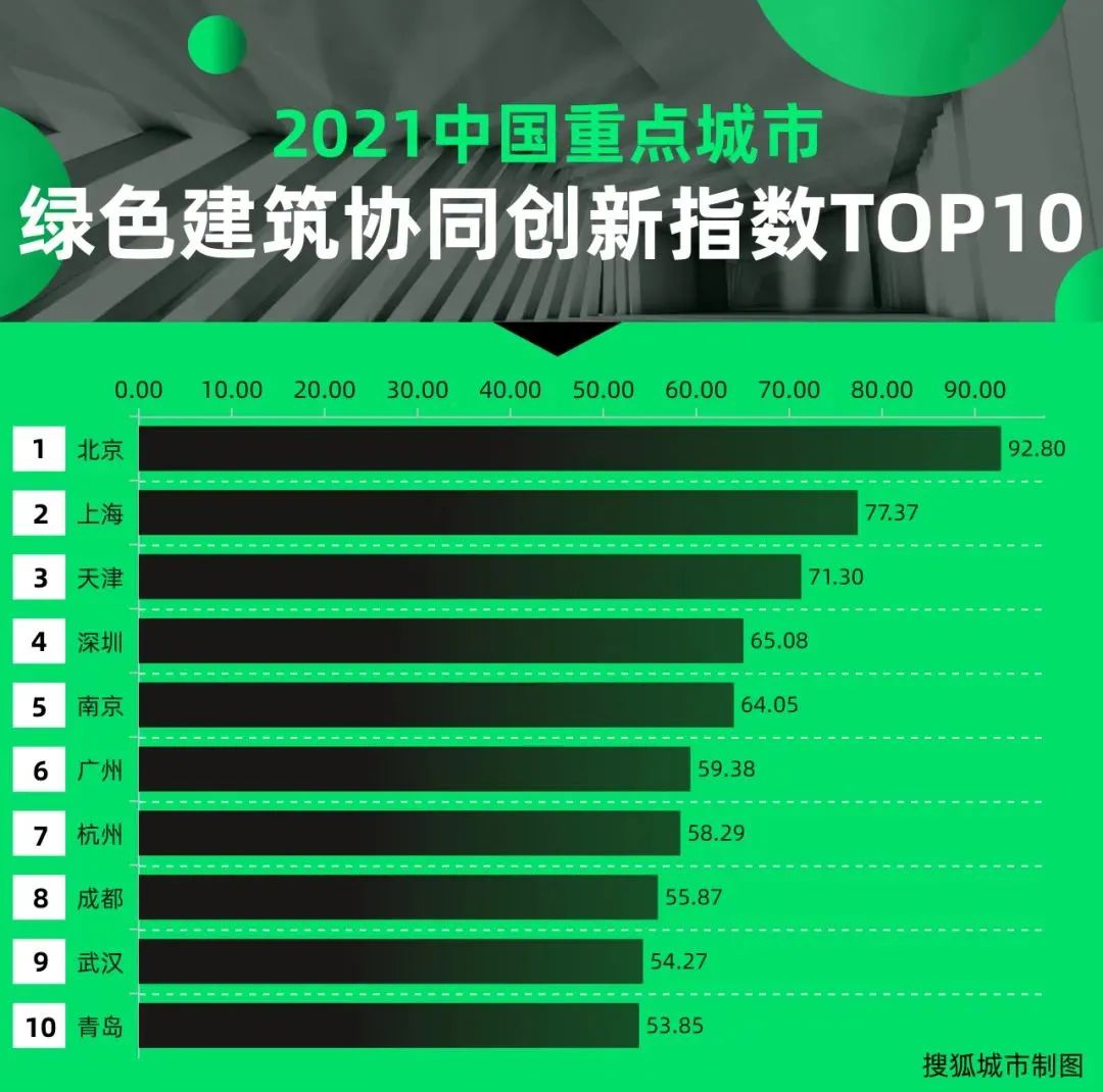 而北京、上海、天津、深圳、南京、广州、杭州、成都、武汉、青岛则分别是绿色建筑协同创新指数十强城市。