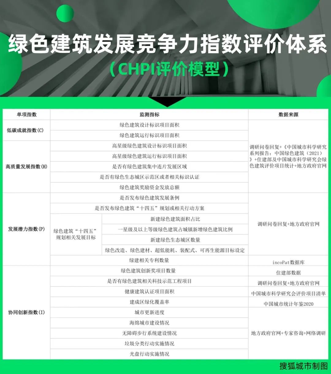为客观评估国内各大城市绿色建筑发展现状,搜狐城市联合中国城市科学研究会、北京清华同衡规划设计研究院,共同创建“中国城市绿色建筑发展竞争力指数评价体系”,联合发布《2021中国城市绿色建筑发展竞争力指数报告》。该报告系国内首份从城市维度评价各地绿色建筑发展竞争力水平的研究成果。