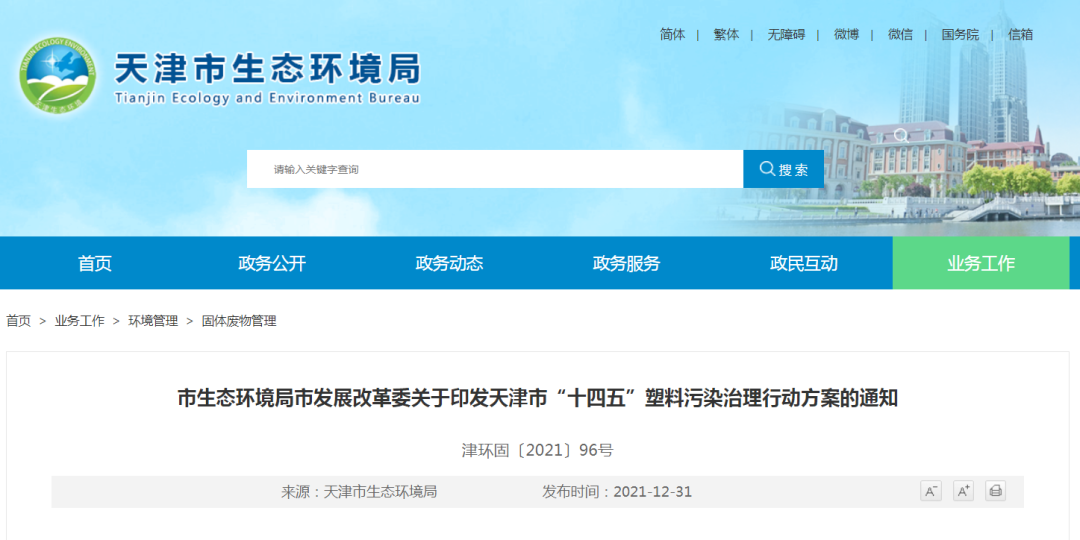 2021年12月24日天津市生态环境局发布了关于印发天津市“十四五”塑料污染治理行动方案的通知。