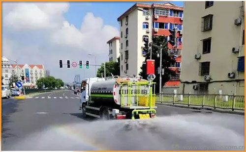 图说:清洗道路的环卫车折射出美丽"彩虹"