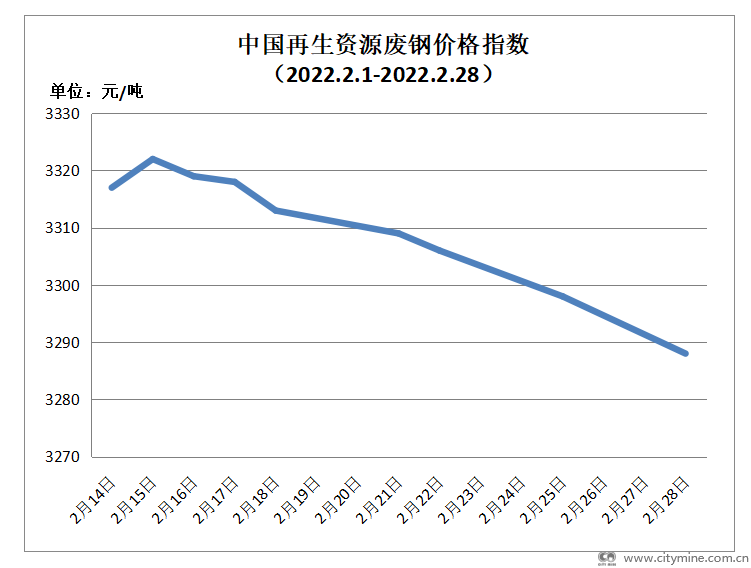2月废钢市场呈现盘整运行状态。截至2022年2月25日,中国再生资源全国重废市场均价为3281.69元/吨,较上期均价上涨31.56元/吨,涨幅0.97%,较去年同期上涨349.79元/吨,同比涨幅为11.93%。协会统计目前河北唐山8厚重废3480-3615元/吨,山东聊城冲花料3460-3470元/吨,张家港重废3350-3400元/吨,浙江嘉兴冲花料3300-3330元/吨,广东冲花料3090-3140元/吨。