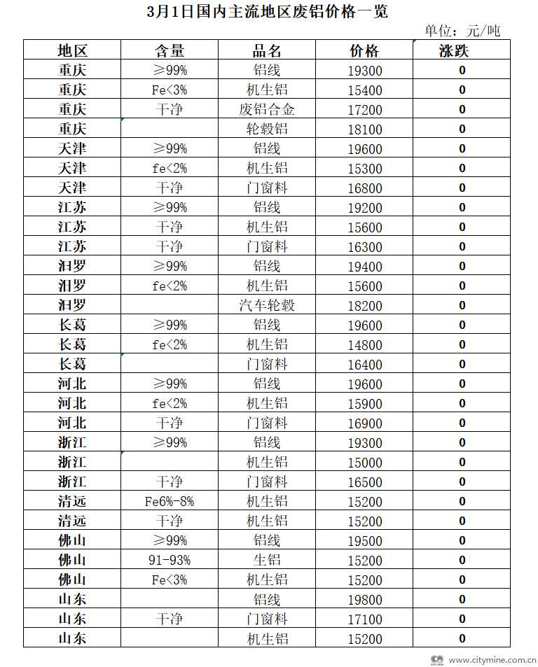 截止2月25日,2月份废铝持续拉涨。铝亮线上涨1300元/吨至19800元/吨,涨幅7.03%;废合金方面:废铝合金门窗料涨1200元/吨至17100元/吨,涨幅7.55%。废生铝方面:废汽车轮毂涨1700元/吨至18200元/吨,涨幅10.3%。大块机铝本期涨1700元/吨至16300元/吨,涨幅11.64%。2月份影响废铝价格波动的主要因素有:春节后铝价上涨为主,从2月7-9日累涨1390元/吨,涨幅6.24%。上涨的主要原因,从基本面上来看,电解铝和氧化铝厂家减产,下游需求维持在淡季水平,贸易商助推价格拉涨,使得价格运行至高位。节后前两周废铝市场恢复偏缓,资源流通量有限,供应整体偏紧张;需求来看,目前开工的厂家多以消化库存为主,少量补货,等到下游厂家全面复工后,铝行情或表现相对稳定,加之需求有所释放,对废铝需求增长,对价格有一定支撑;2月下旬,贸易商对税收政策较为关注,尤其政策落地不明确,贸易商清库存为主,中小型企业对原料采购观望,少量补货,小型贸易商出货较为积极。市场上的玩家多关注3月份税收政策落地实施再进行操作。