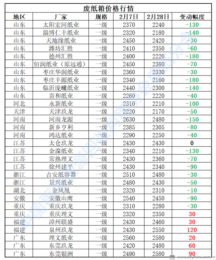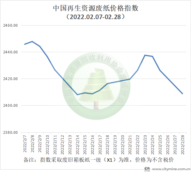 2月7日废纸价格指数为2446元/吨,2月28日废纸价格指数为2409元/吨,约下调37元/吨。