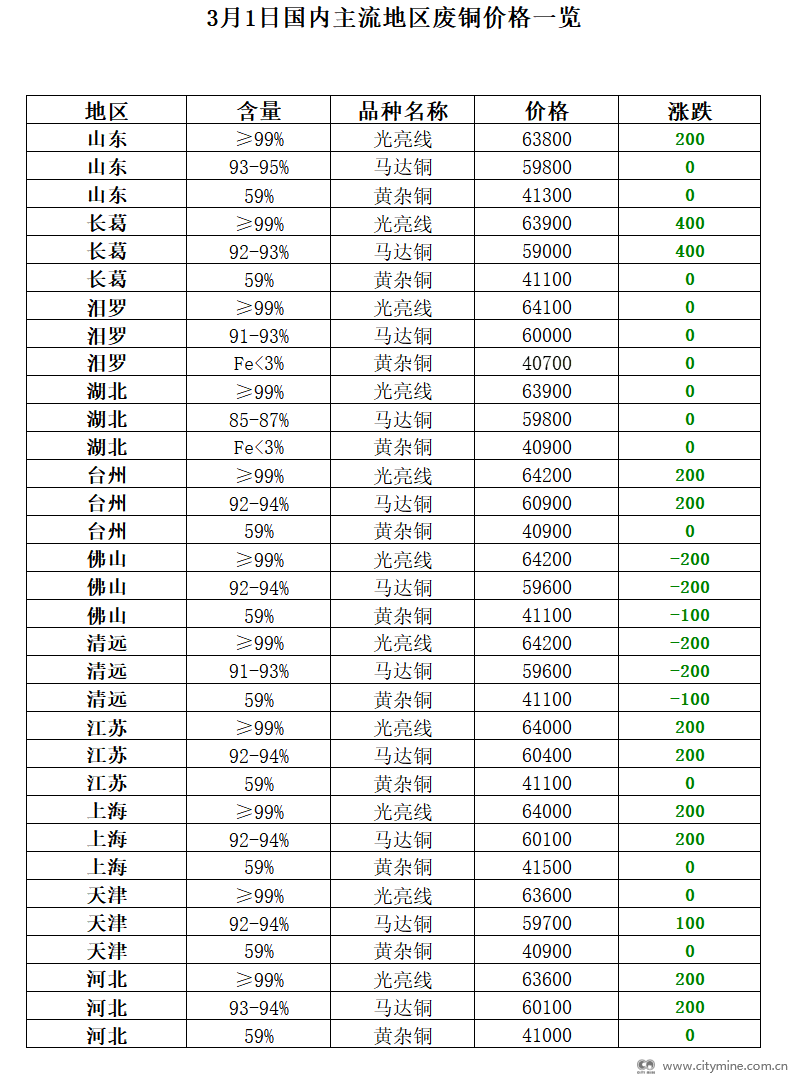 2月废铜价格上涨有限,精废价差维持在2000元/吨,去库存较多,成交一般。2月25日河北地区光亮铜贸易商回收价格为63700元/吨,较上期上涨500元/吨;广东地区光亮铜价格为64400元/吨,较上期上涨700元/吨;而天津、河北地区铜厂收购报价为63900元/吨,较上期价格上涨500元/吨。本月废铜市场因3月成交需要含税,上游贸易商积极出货,而江西则早早开工,消耗库存和加紧交付订单,废铜短期内出现供大于求的市场行情。临近月底,铜厂多数压价采购,甚至江西、湖北和河北等铜厂选择暂停采购,最后一周成交陷入僵持阶段,上下游选择低仓谨慎成交。低氧杆市场成交相对较好,江西某厂2月产能达1万吨以上,精废价差的短期利好,给予低氧铜杆更多市场空间,交投活跃度较高。此外,协会调研了河北11家再生铜厂,能够正常产销的企业在5家,产量多在1000-1500吨,开工率整体偏低。主要原因除去含税成交影响,次要原因在于当地冬奥会举办,企业减产或者需等当地政策后开工。后市分析,当前市场含税价格陆续出现,但厂家之间仍未形成统一,建议市场暂时观望。