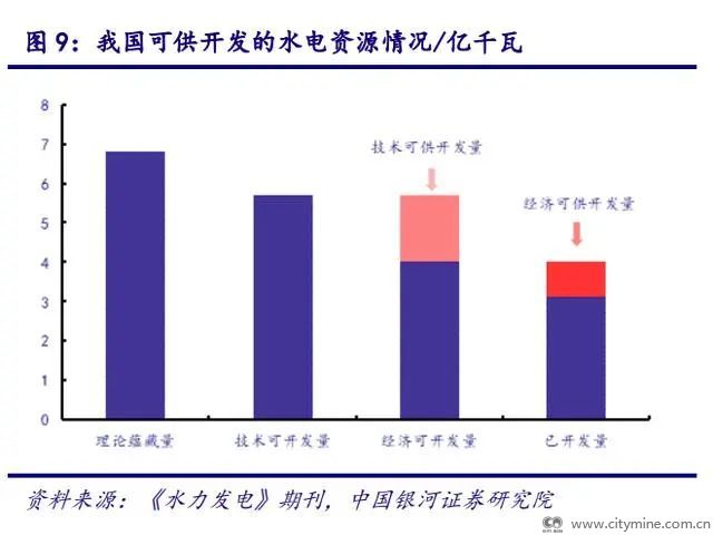 非水可再生能源增长空间有限。我国水电资源理论蕴藏量是 6.8 亿千瓦,其中技术可开发量约 5.7 亿千瓦,经济可开发量约 4 亿千瓦,截至 2021 年底,6000 千瓦以上的常规水电装机规模已达到 3.5 亿千瓦,水电发展存在理论上限。而核电由于建设周期长,通常建设周期至少五年,“十四五”期间预计将新增 15 台核电机组,对应 1610 万千瓦装机规模。由于非化石能源中水电及核电增量有限,为实现“双碳”目标,新能源发电将迎来确定性快速增长。
