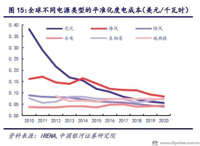相较全球,中国新能源发电的度电成本较低。2020 年中国光伏发电 LCOE 为 0.044 美元/ 千瓦时,比全球光伏发电 LOCE 低 0.013 美元/千瓦时,较 2010 年的 0.305 美元/kWh 下降 85.6%;2020 年中国陆上风电 LCOE 为 0.033 美元/千瓦时,比全球陆上风电 LOCE 低 0.006 美元/千瓦时,较 2010 年的 0.073 美元/千瓦时下降 54.8%。随着未来风电规模的增加,技术的更新迭代,我国新能源发电 LCOE 成本将更具优势,逐渐成为电力供应的主力。
