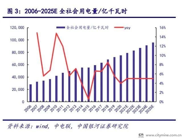 电力消费总体保持平稳较快增长水平。根据中电联发布的数据,2021年我国全社会用电量为 8.31 万亿千瓦时,同比增长 10.3%,用电量快速增长主要受国内经济持续恢复发展、上年同期低基数、外贸出口快速增长等因素拉动。分产业来看,2021年第一产业用电量同比增长 16.4%,第二产业用电量同比增长 9.1%,第三产业用电量同比增长 17.8%,居民生活用电同比增长 7.3%,电力消费总体保持平稳较快增长水平。