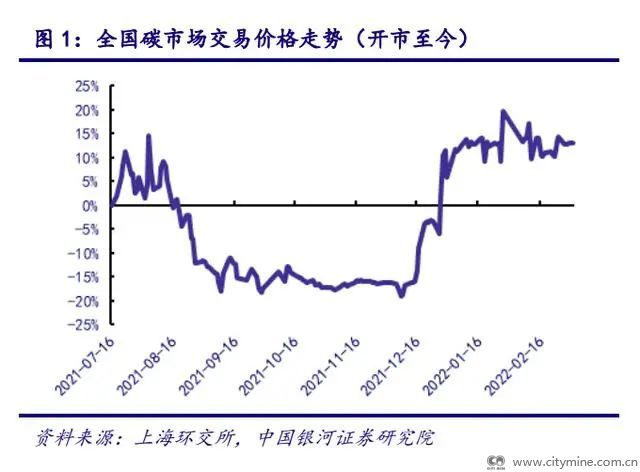 全国碳市场总体运行平稳有序,价格发现功能逐步显现。2021 年 7 月,全国碳交易市场正式启动,截至 2022 年 3 月 11 日,全国市场排放配额(CEA)累计成交量达到了 1.88 亿吨,其中挂牌协议成交量 3196.10 万吨,大宗协议成交量 15656.36 万吨;累计成交额 81.80 亿元,成交均价 43.51 元/吨,其中挂牌协议成交额15.20 亿元,成交均价 47.56 元/吨,大宗协议成交额 66.60 亿元,成交均价 42.54 元/吨。3 月11日全国碳市场碳排放配额(CEA)收盘价为 57.60 元/吨,较开市时上涨 12.43%。第一个履约周期结束后,CEA 价格稳定在 55 元/吨以上。