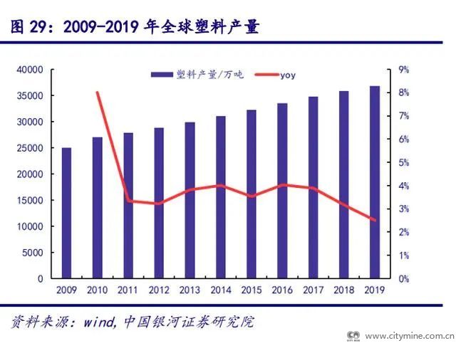 塑料应用广泛,亚洲塑料树脂产量占全球过半。塑料以重量轻、可塑性强、制造成本低、功能广泛等特点在现代社会中得到了广泛的应用,已成为人类不可或缺的重要材料。全球塑料产量稳步增长,2019 年全球塑料树脂产量达到了 36,800 万吨,同比增长 2.5%。亚洲是全球最大的塑料树脂生产地,占全球总产量超过 50%。