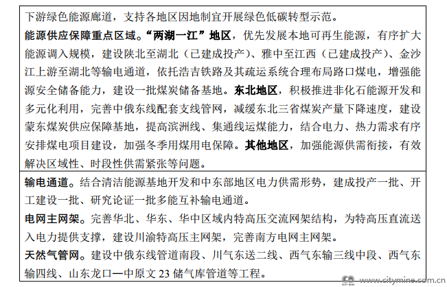 加强煤炭安全托底保障。优化煤炭产能布局,建设山西、蒙西、蒙东、陕北、新疆五大煤炭供应保障基地,完善煤炭跨区域运输通道和集疏运体系,增强煤炭跨区域供应保障能力。持续优化煤炭生产结构,以发展先进产能为重点,布局一批资源条件好、竞争能力强、安全保障程度高的大型现代化煤矿,强化智能化和安全高效矿井建设,禁止建设高危矿井,加快推动落后产能、无效产能和不具备安全生产条件的煤矿关闭退出。建立健全以企业社会责任储备为主体、地方政府储备为补充、产品储备与产能储备有机结合的煤炭储备体系。