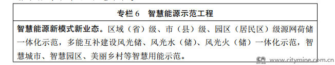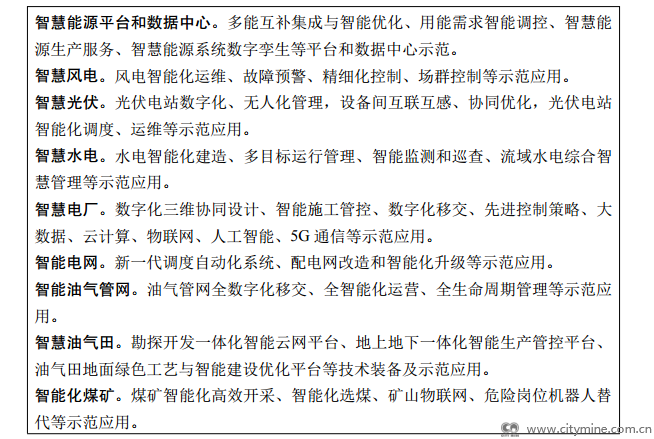 实施智慧能源示范工程。以多能互补的清洁能源基地、源网荷储一体化项目、综合能源服务、智能微网、虚拟电厂等新模式新业态为依托,开展智能调度、能效管理、负荷智能调控等智慧能源系统技术示范。推广电力设备状态检修、厂站智能运行、作业机器人替代、大数据辅助决策等技术应用,加快“智能风机”、“智能光伏”等产业创新升级和行业特色应用,推进“智慧风电”、“智慧光伏”建设,推进电站数字化与无人化管理,开展新一代调度自动化系统示范。实施煤矿系统优化工程,因地制宜开展煤矿智能化示范工程建设,建设一批少人、无人示范煤矿。加强油气智能完井工艺攻关,加快智能地震解释、智能地质建模与油藏模拟等关键场景核心技术开发与应用示范。建设能源大数据、数字化管理示范平台。