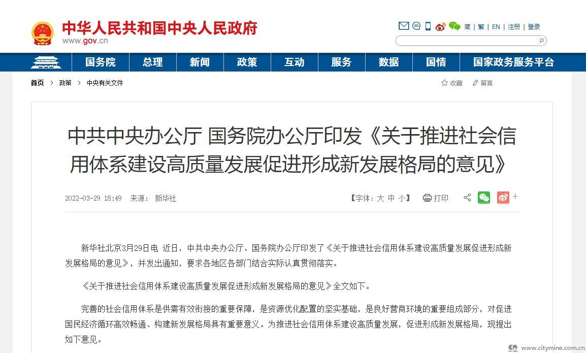 2022年03月31日近日,中共中央办公厅、国务院办公厅印发了《关于推进社会信用体系建设高质量发展促进形成新发展格局的意见》,并发出通知,要求各地区各部门结合实际认真贯彻落实。