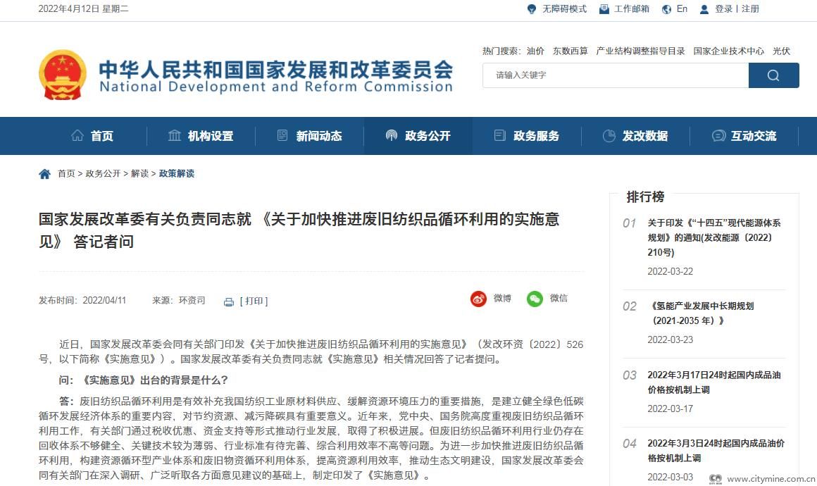 2022年04月12日近日,国家发展改革委会同有关部门印发《关于加快推进废旧纺织品循环利用的实施意见》(发改环资〔2022〕526号,以下简称《实施意见》)。国家发展改革委有关负责同志就《实施意见》相关情况回答了记者提问。