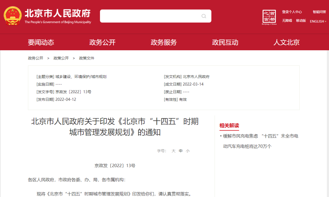 2022年04月21日4月12日,北京市人民政府印发《北京市“十四五”时期城市管理发展规划》。