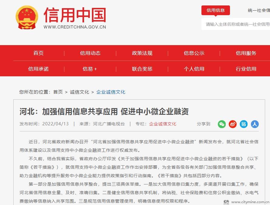 2022年04月22日河北省积极落实《国务院办公厅关于印发加强信用信息共享应用促进中小微企业融资实施方案的通知》(国办发〔2021〕52号),印发《关于加强信用信息共享应用促进中小微企业融资的若干措施》,就信用支持中小微企业融资工作作出安排部署。