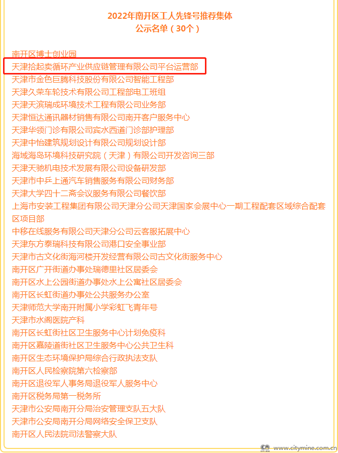 4月20日,南开区总工会公示了2022年南开区五一劳动奖和工人先锋号候选名单。拾起卖集团旗下天津拾起卖循环产业供应链管理有限公司平台运营部入选 2022年南开区工人先锋号推荐集体公示名单。