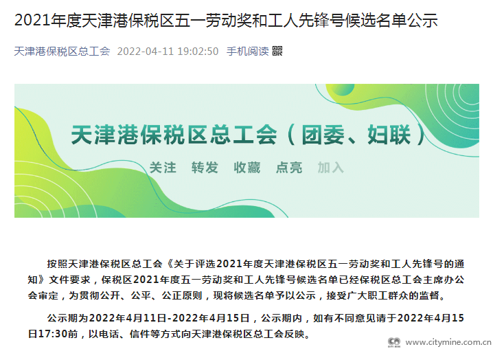 2022年04月25日4月11日,天津港保税区总工会发布2021年度天津港保税区五一劳动奖和工人先锋号候选名单,天津拾起卖科技有限公司(现已更名为天津拾起卖科技集团有限公司)入选天津港保税区2021年度五一劳动奖状候选名单。