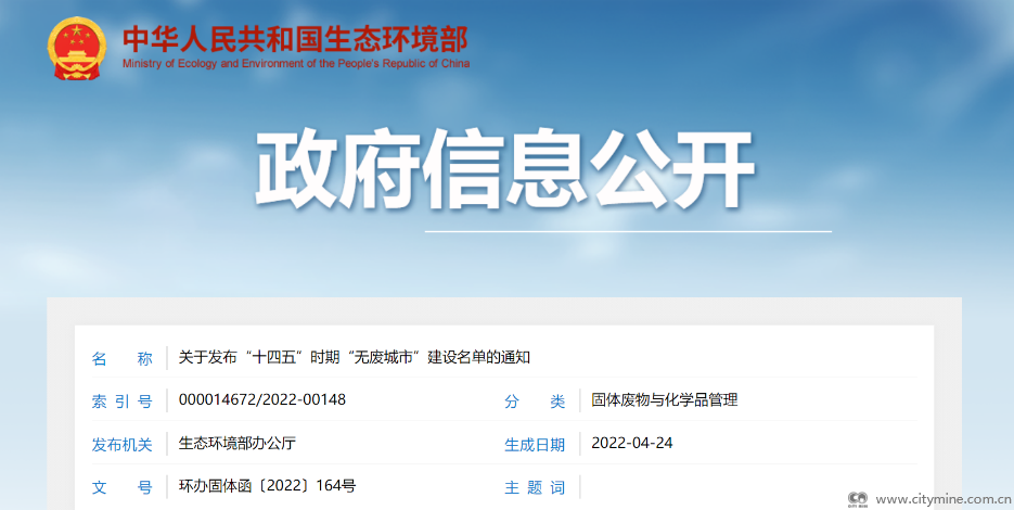 2022年04月26日生态环境部根据各省份推荐情况,综合考虑城市基础条件、工作积极性和国家相关重大战略安排等因素,确定了“十四五”时期开展“无废城市”建设的城市名单(见附件),现予以公布。