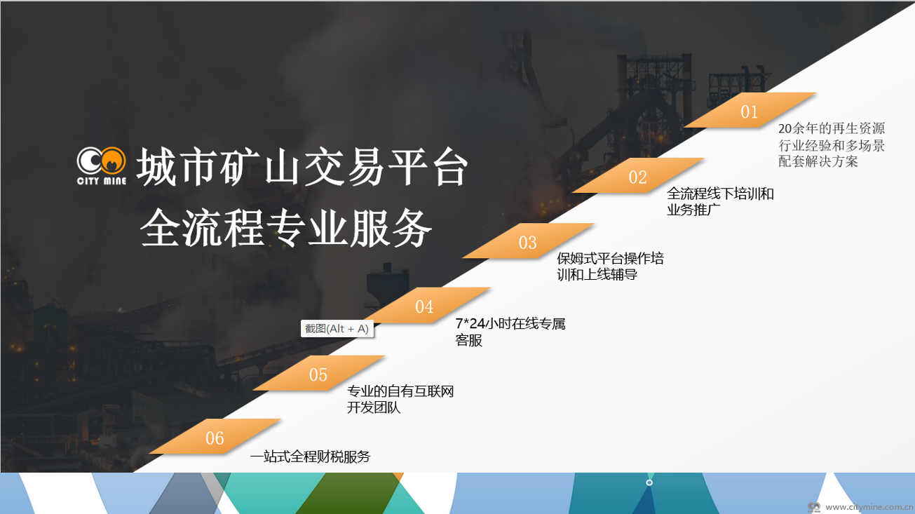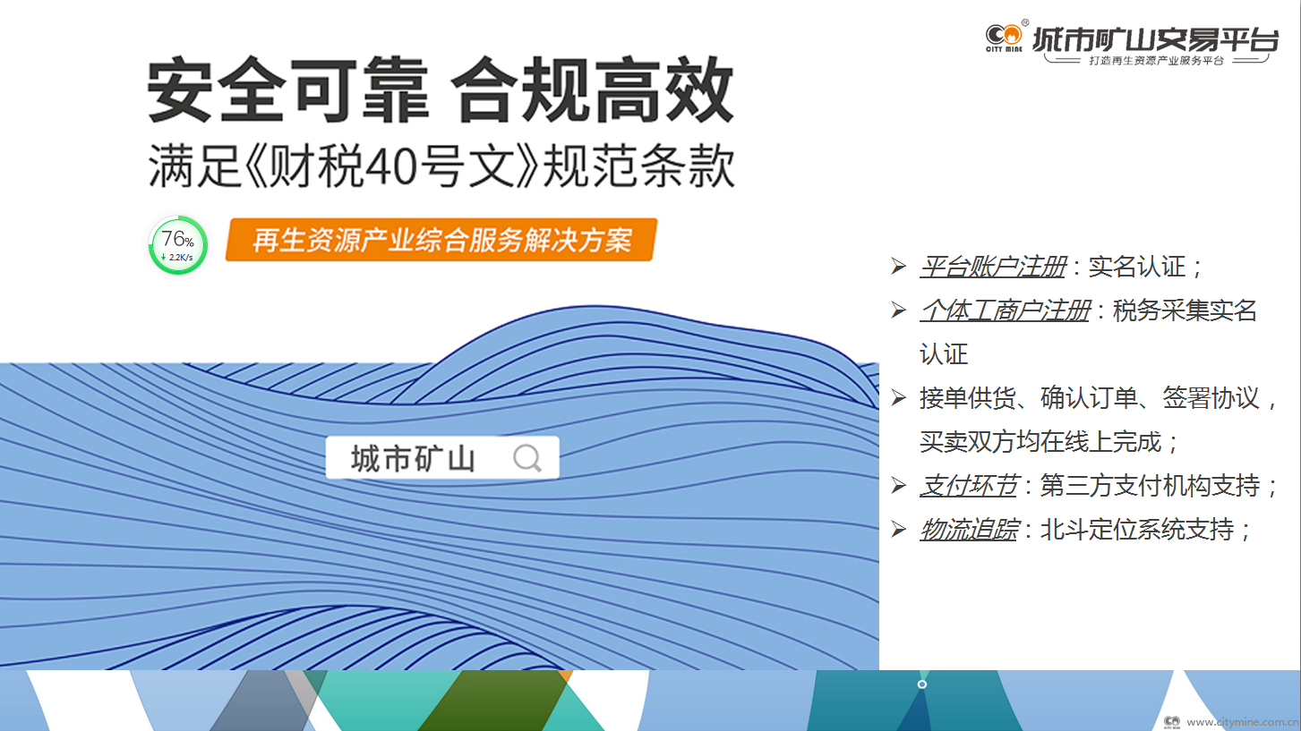 拾起卖“城市矿山交易平台”客服部经理李萍向大家详细介绍平台概况时提到,城市矿山交易平台,满足财税40号文规范条款,为再生资源产业提供综合解决方案,具有:实力优势、管理优势、安全合规优势、高效便捷优势和多元化优势。