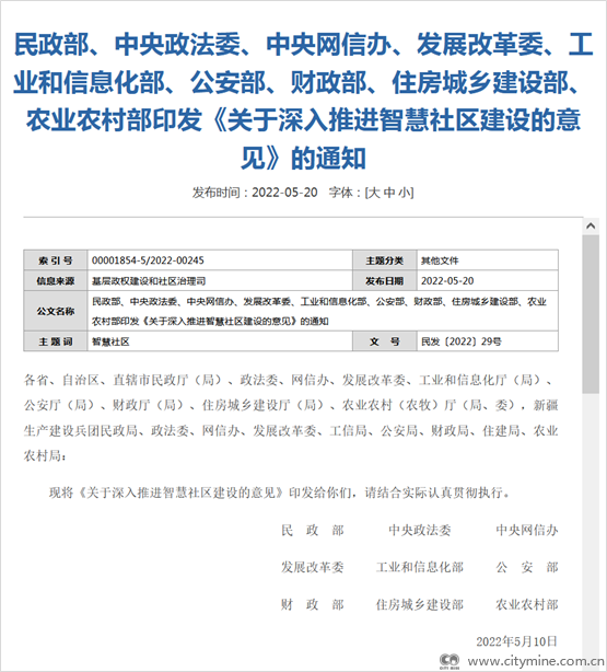 2022年05月27日近日,民政部、中央政法委、中央网信办、发展改革委、工业和信息化部、公安部、财政部、住房城乡建设部、农业农村部等9部门印发《关于深入推进智慧社区建设的意见》(以下简称《意见》),明确了智慧社区建设的总体要求、重点任务和保障措施等。明确了智慧社区建设的总体要求、重点任务和保障措施等。