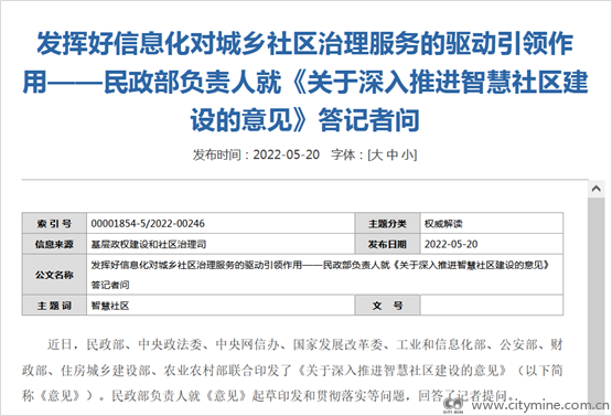 2022年05月27日近日,民政部、中央政法委、中央网信办、国家发展改革委、工业和信息化部、公安部、财政部、住房城乡建设部、农业农村部联合印发了《关于深入推进智慧社区建设的意见》(以下简称《意见》)。民政部负责人就《意见》起草印发和贯彻落实等问题,回答了记者提问。
