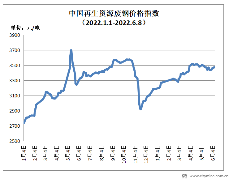 今日中国再生资源废钢价格指数3473元/吨,较上个交易日上涨5元/吨。今日废钢市场稳中小幅调整。目前来看,下游需求不佳,成材出货不畅,钢企利润低迷,继续调涨采购意愿不强。而废钢到货情况一般又在一定程度上支撑价格,跌价亦不易。短期市场继续盘整运行。