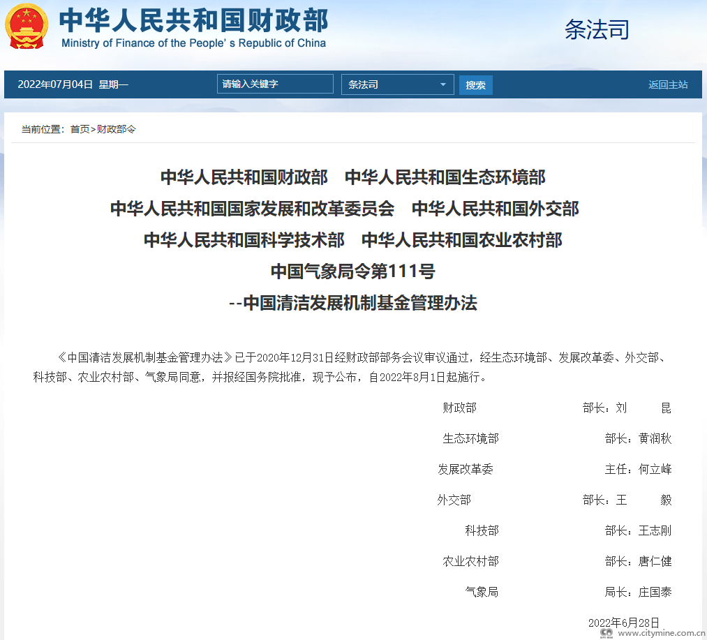 2022年07月07日为贯彻落实党中央减污降碳协同增效重大战略部署,助力高质量完成碳达峰碳中和重大战略决策,2022年6月28日,财政部、生态环境部、发展改革委、外交部、科技部、农业农村部、气象局公布《中国清洁发展机制基金管理办法》,自2022年8月1日起施行。