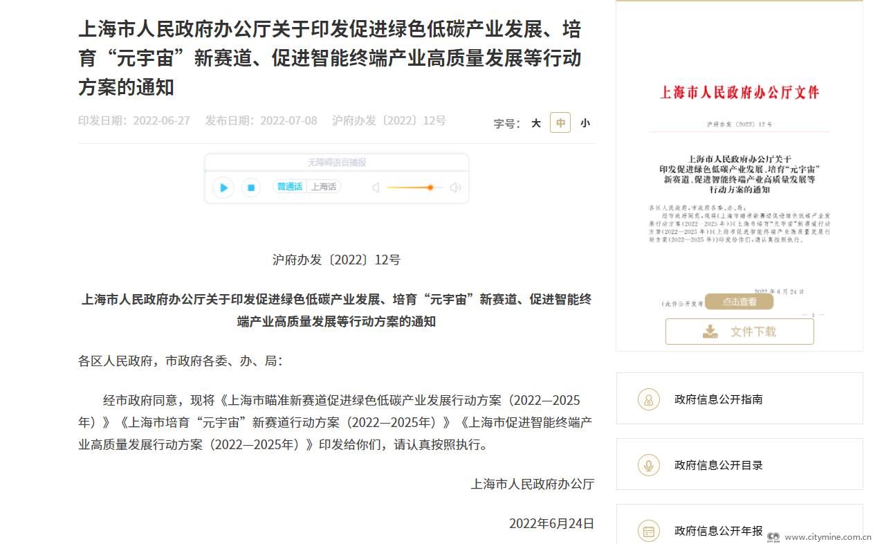 上海市人民政府办公厅关于印发促进绿色低碳产业发展、培育“元宇宙”新赛道、促进智能终端产业高质量发展等行动方案的通知