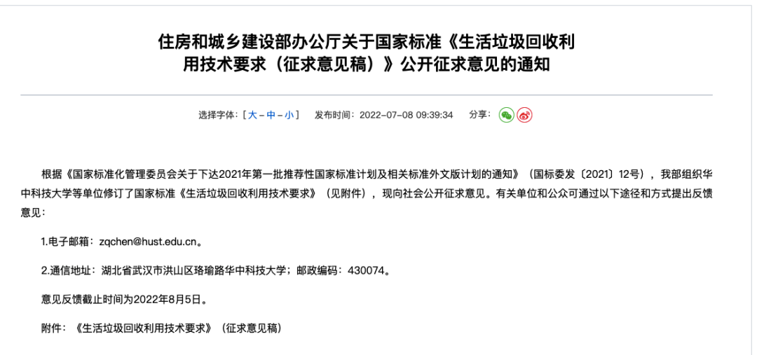 国家标准《生活垃圾回收利用技术要求》公开征求意见!
