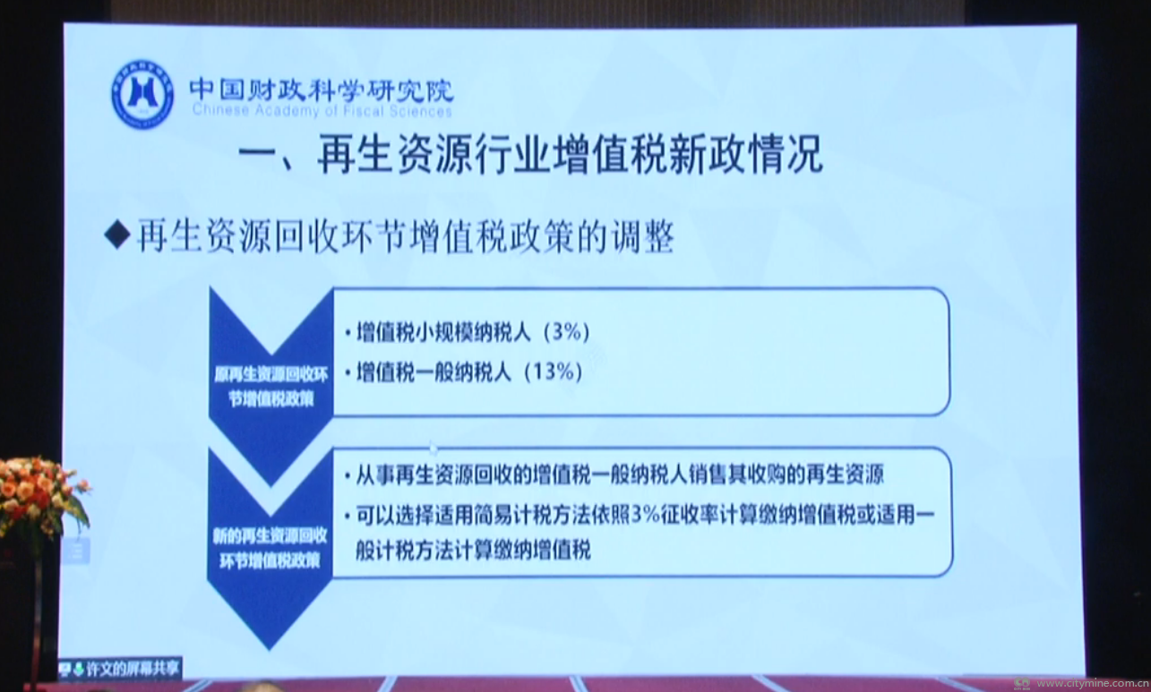 中国财政科学院研究员许文以“新税法3个月行业典型问题与国家税务政策解读”为主题发表线上演讲,主要介绍了再生资源行业整治税新政情况,探讨了行业典型增值税政策问题,包括增值税政策的调整和相关规定。