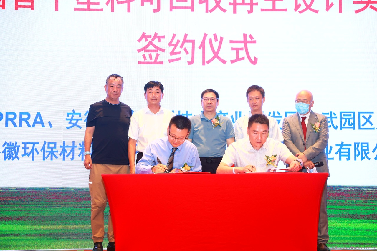 接着举行“中国首个塑料可回收再生设计实验室签约仪式”,该实验室预算500万,同时满足国际、中国CPRRA技术和装备要求,这是中国首个塑料可回收再生实验室。在CPRRA和安徽界首高新技术产业开发区光武园区见证下,北京臻徽环保材料科技有限公司和安徽冠泓塑业有限公司签约。