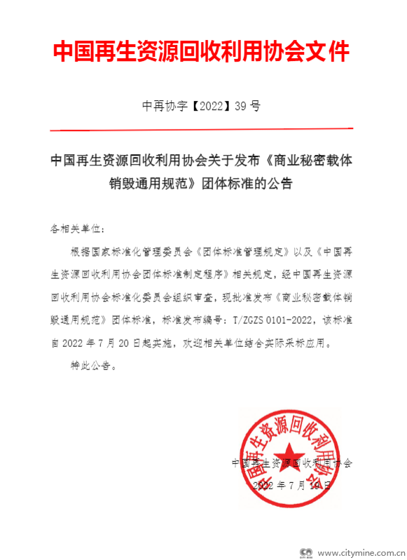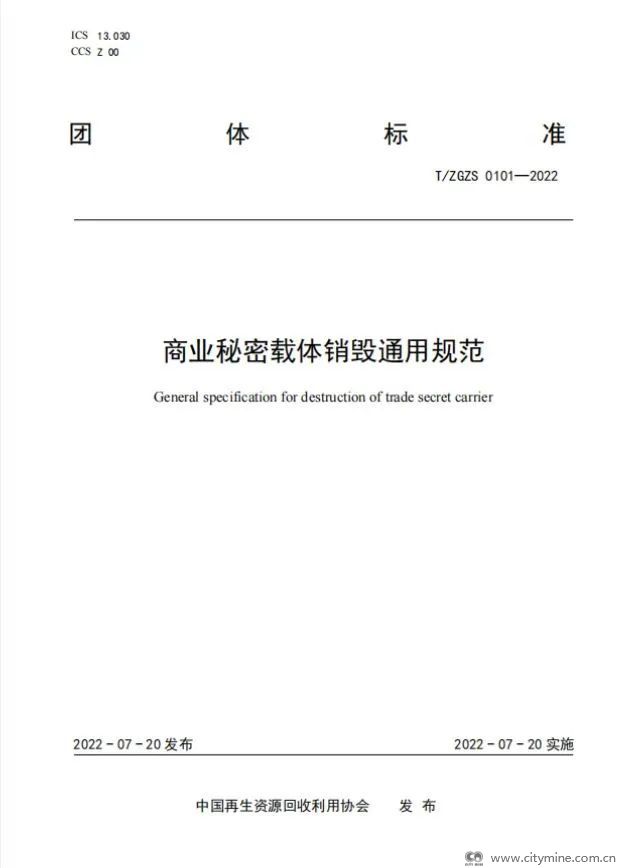2022年07月21日根据国家标准化管理委员会《团体标准管理规定》以及《中国再生资源回收利用协会团体标准制定程序》相关规定,经中国再生资源回收利用协会标准化委员会组织审查,现批准发布《商业秘密载体销毁通用规范》团体标准,标准发布编号:T/ZGZS 0101-2022,该标准自2022年7月20日发布并实施,欢迎相关单位结合实际采标应用。