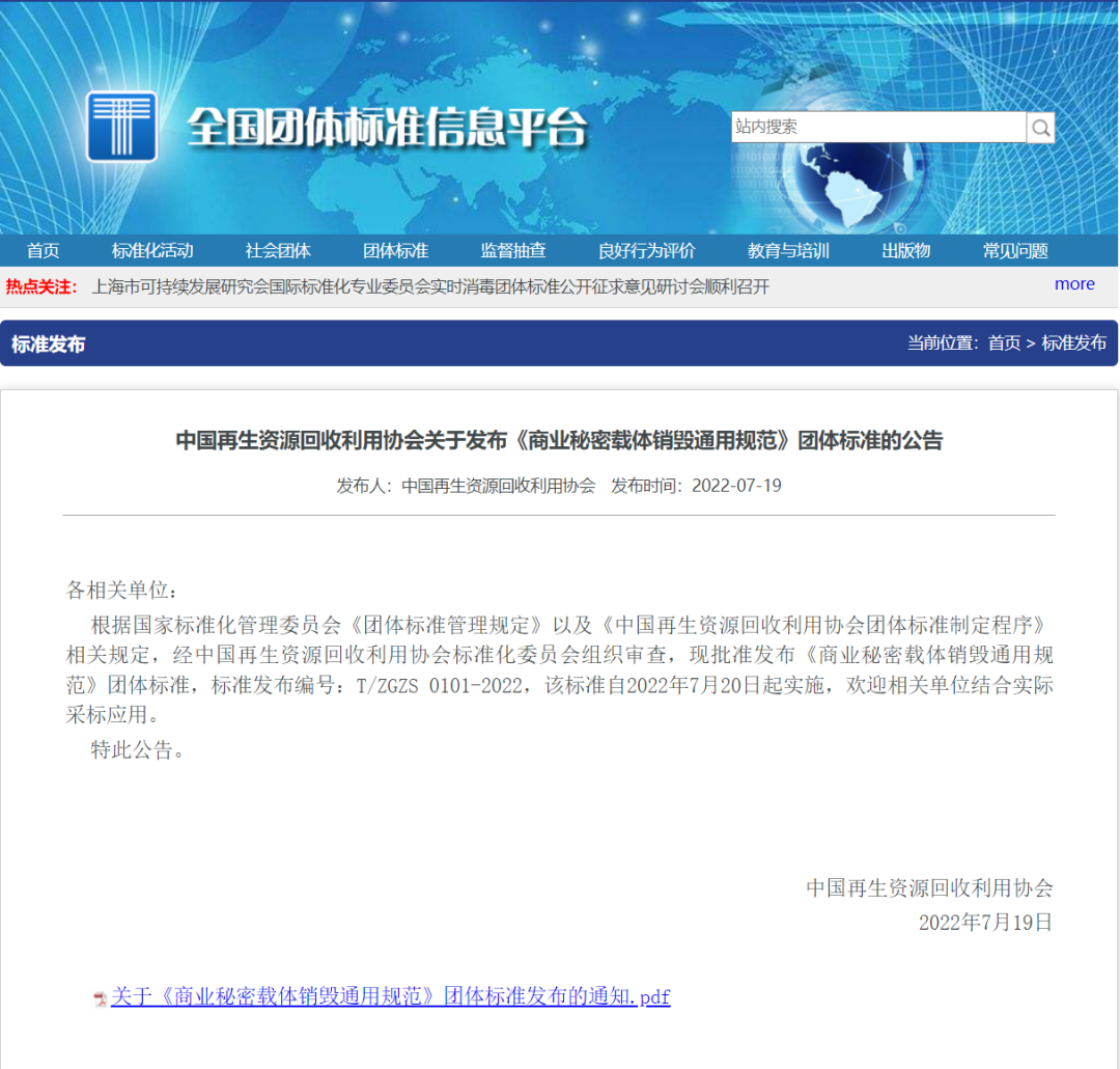 关于发布《商业秘密载体销毁通用规范》团体标准的公告