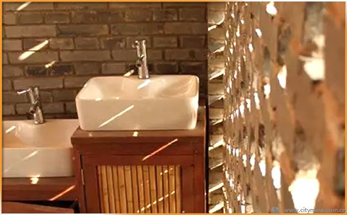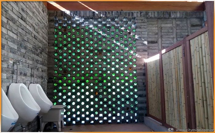 生态厕所的建筑墙体使用了当地生产的青砖与回收利用的啤酒瓶,隐隐约约的透过光与影,视觉上实现建筑与自然的融合。