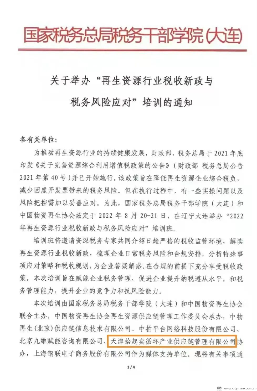 原标题:拾起卖协助国家税务总局税务干部学院、中国物资再生协会举办“再生资源行业税收新政与税务风险应对”培训