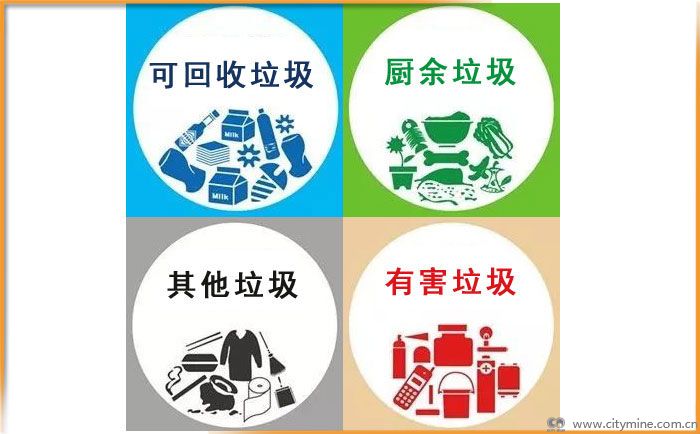如今我国的生活垃圾一般可分为四大类:可回收垃圾、厨余垃圾、有害垃圾和其他垃圾。目前常用的垃圾处理方法主要有:综合利用、卫生填埋、焚烧发电、堆肥、资源返还。