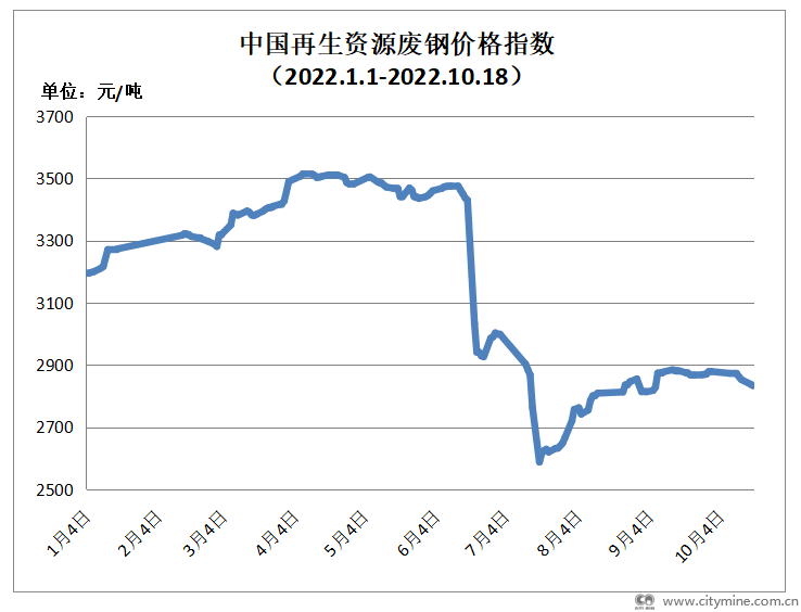 今日中国再生资源废钢价格指数2833元/吨,较上交易日下跌5元/吨。截止到2022年10月18日下午16:00,调研河北8厚重废成交价格2920-3020元/吨,较上一工作日持平。今华北废钢市场交投一般,昨涨价钢企到货量个别小幅增加,维稳观望到货为主。市场贸易商反馈:今下游成材走势下行,市场心态以出货避险为主,但场地库存低位,个别场地采购意愿偏弱,出货能力下降,高价货源出货意愿较低。唐山部分场地采购难度较大,个别停收放假。下游企业反馈:今主导钢企到货量低于预期水平,前期涨价钢企个别到货量略微好转。高价钢企江浙地区货源流入,但多为集装箱采购,运输时间较长。目前到货量尚可的钢企考虑废钢原料成本压力问题,短期依旧存下行空间。