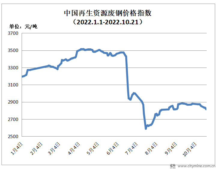 今日中国再生资源废钢价格指数2815元/吨,较上交易日下跌12元/吨。截止到2022年10月21日下午16:00,信息网调研河北8厚重废成交价格2870-2980元/吨,较上一工作日跌45元/吨。今华北废钢市场交投一般,主导钢企价格再度调降,市场存恐跌情绪,中低价货源交投意愿强烈。主导钢企消耗量维持偏低水平。