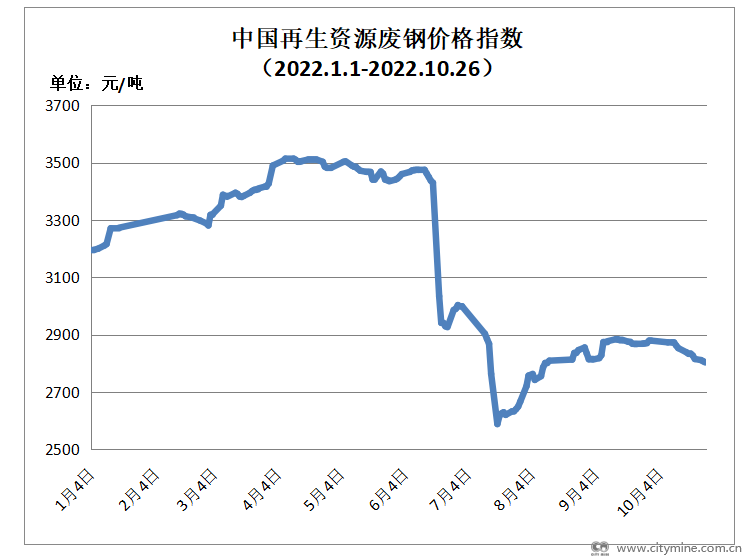 今日中国再生资源废钢价格指数2803元/吨,较上交易日下跌4元/吨。截止到2022年10月26日下午16:00,信息网调研河北8厚重废成交价格2810-2910元/吨,较上一工作日跌50元/吨。昨日至今华北主导钢企价格下行,高价市场交投意愿增强,场地存避险心态。钢企需求端依旧表现偏弱。