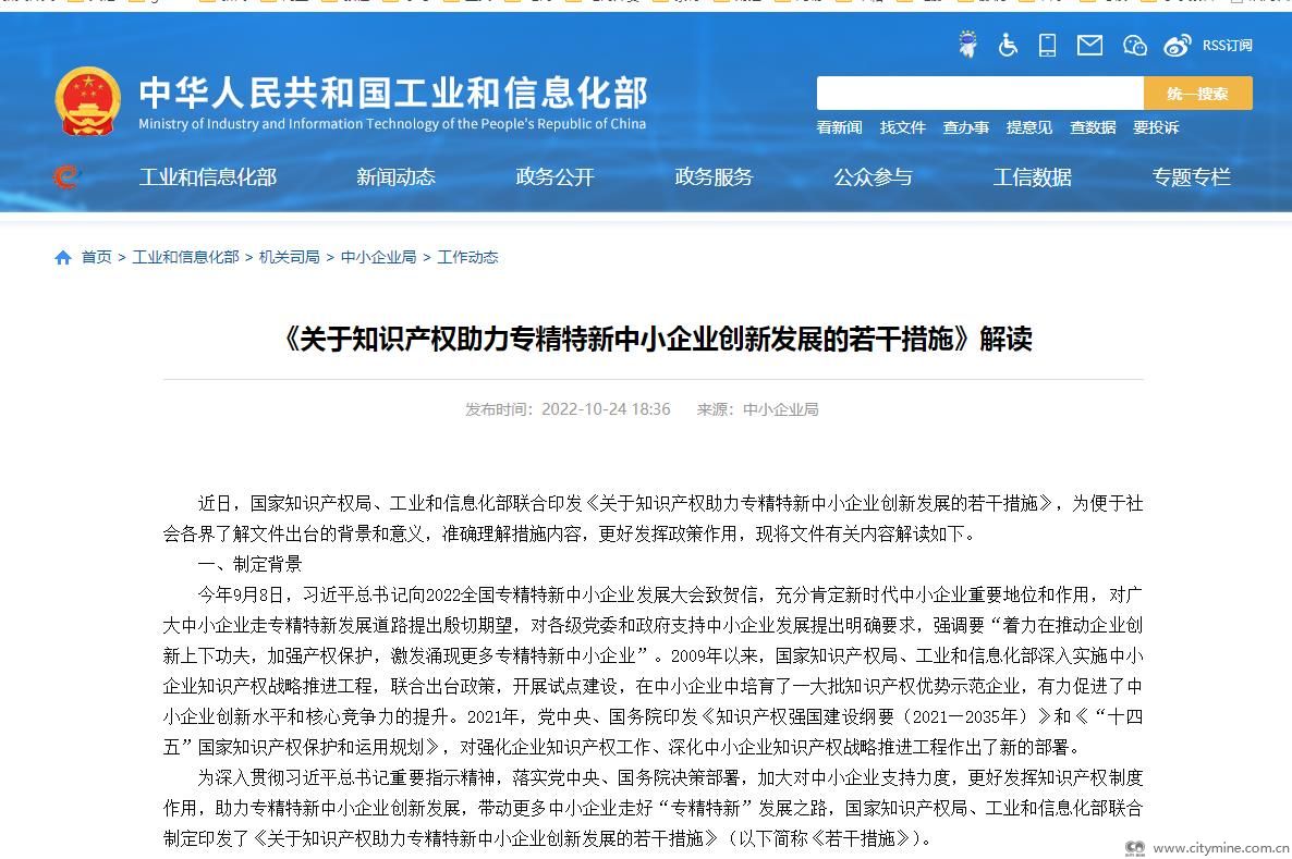 2022年10月27日近日,国家知识产权局、工业和信息化部联合印发《关于知识产权助力专精特新中小企业创新发展的若干措施》(以下简称《若干措施》),提出了“提升知识产权创造水平,增强企业创新能力“、”促进知识产权高效运用,提高企业核心竞争力“、”加强知识产权保护,护航企业创新发展“等措施内容。