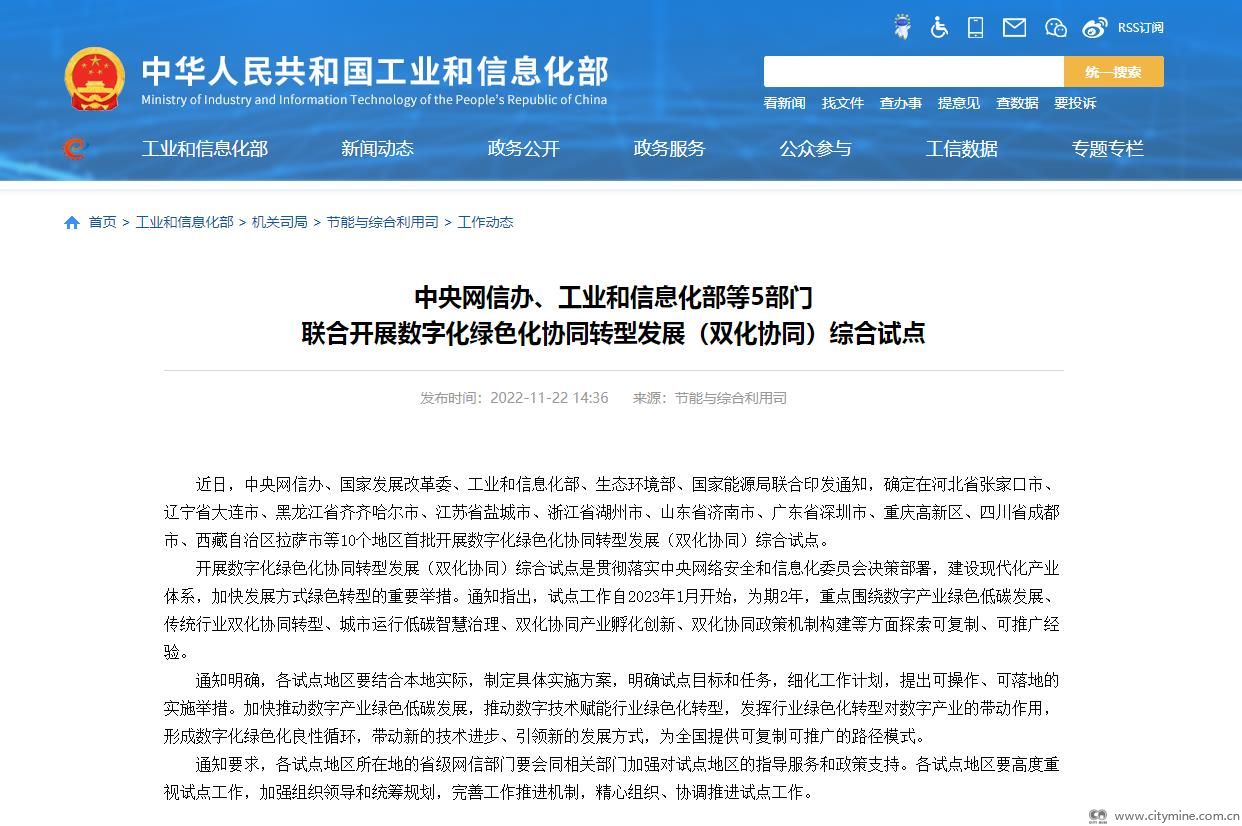 近日,中央网信办、国家发展改革委、工业和信息化部、生态环境部、国家能源局联合印发通知,确定在河北省张家口市、辽宁省大连市、黑龙江省齐齐哈尔市、江苏省盐城市、浙江省湖州市、山东省济南市、广东省深圳市、重庆高新区、四川省成都市、西藏自治区拉萨市等10个地区首批开展数字化绿色化协同转型发展(双化协同)综合试点。