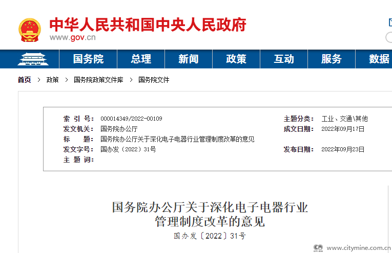9月17日,国务院办公厅印发《关于深化电子电器行业管理制度改革的意见》支持优化电子电器产品回收处理行业健康发展。强调指出,要坚决落实废弃电子电器产品税收优惠政策,充分发挥现行资源综合利用税收优惠政策的激励引导作用,合理降低废弃电子电器产品处理企业负担;着力优化废弃电子电器产品回收处理网络布局,持续提升废弃电子电器产品资源化利用和无害化处理水平;支持有关企业建设回收网点、中转仓库,推动健康稳定发展。