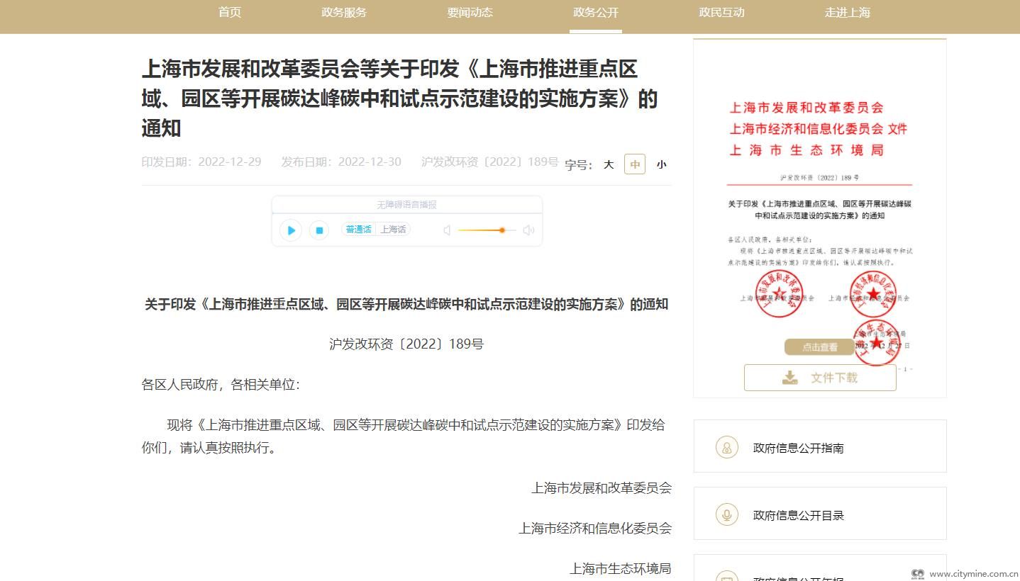 上海市推进重点区域、园区等开展碳达峰碳中和试点示范建设的实施方案