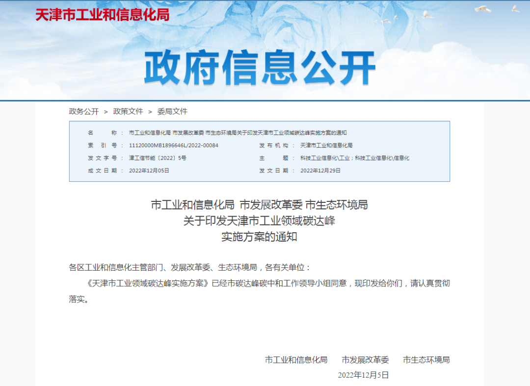 2023年01月05日12月29日,天津市工业和信息化局、市发展改革委、市生态环境局联合发布《天津市工业领域碳达峰实施方案》。