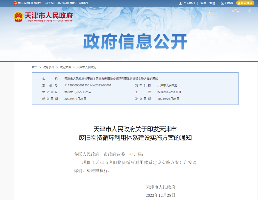 2023年01月05日为加快构建废旧物资循环利用体系,提高资源循环利用水平,推动经济社会发展绿色化、低碳化,2023年1月4日,天津市人民政府发布了《天津市废旧物资循环利用体系建设实施方案》。