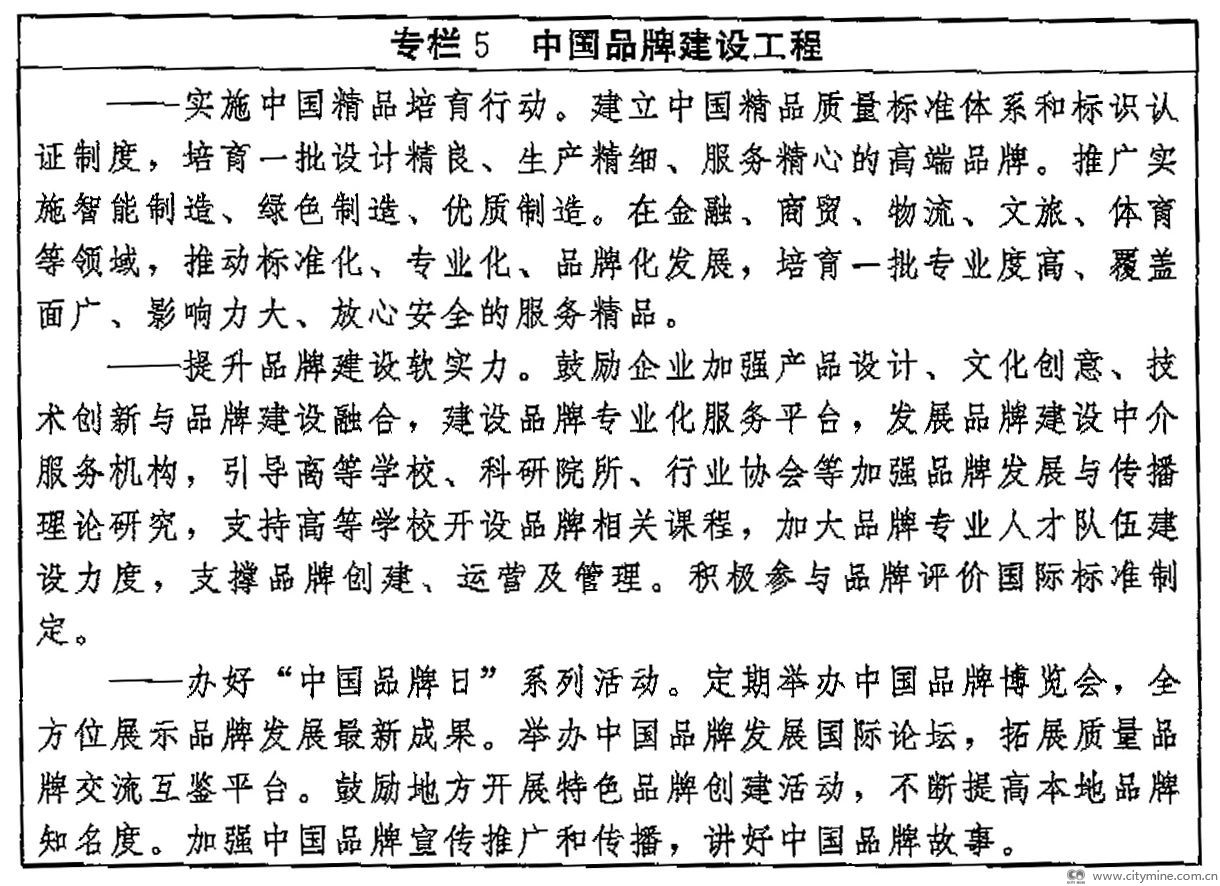 ——品牌建设取得更大进展。品牌培育、发展、壮大的促进机制和支持制度更加健全,品牌建设水平显著提高,企业争创品牌、大众信赖品牌的社会氛围更加浓厚,品质卓越、特色鲜明的品牌领军企业持续涌现,形成一大批质量过硬、优势明显的中国品牌。