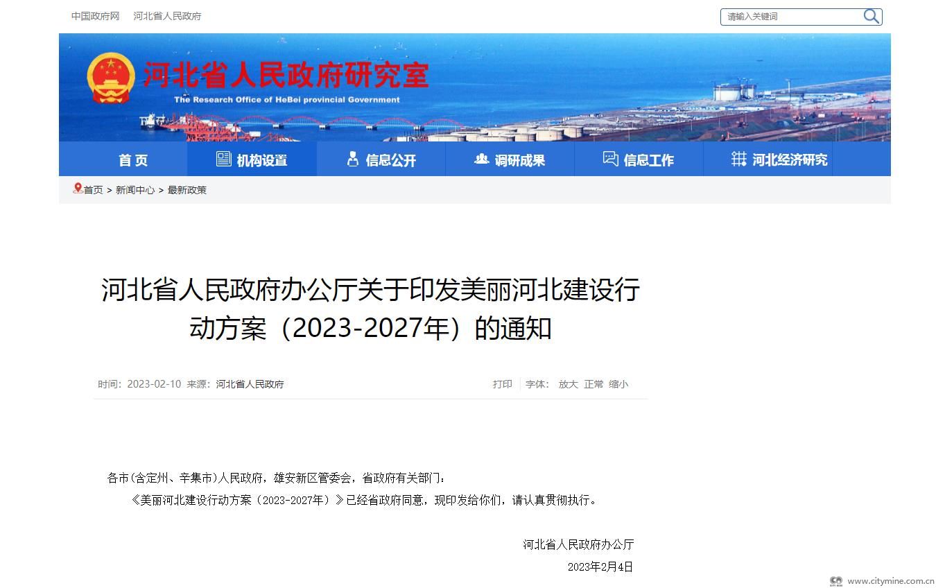 2023年02月16日2月6日,河北省人民政府发布《河北省人民政府办公厅关于印发美丽河北建设行动方案(2023-2027年)的通知》。《美丽河北建设行动方案(2023-2027年)》(以下简称《方案》),牢固树立和践行绿水青山就是金山银山理念,统筹产业结构调整、污染治理、生态保护、应对气候变化,协同推进降碳、减污、扩绿、增长,以标志性行动全力打造中国式现代化河北场景。