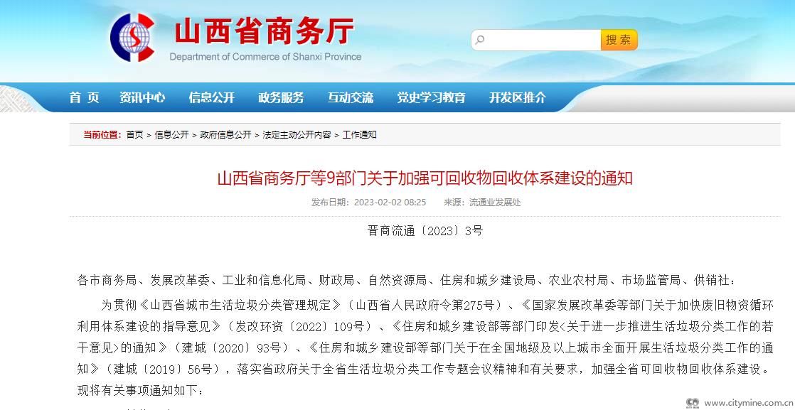 山西省商务厅等9部门关于加强可回收物回收体系建设的通知