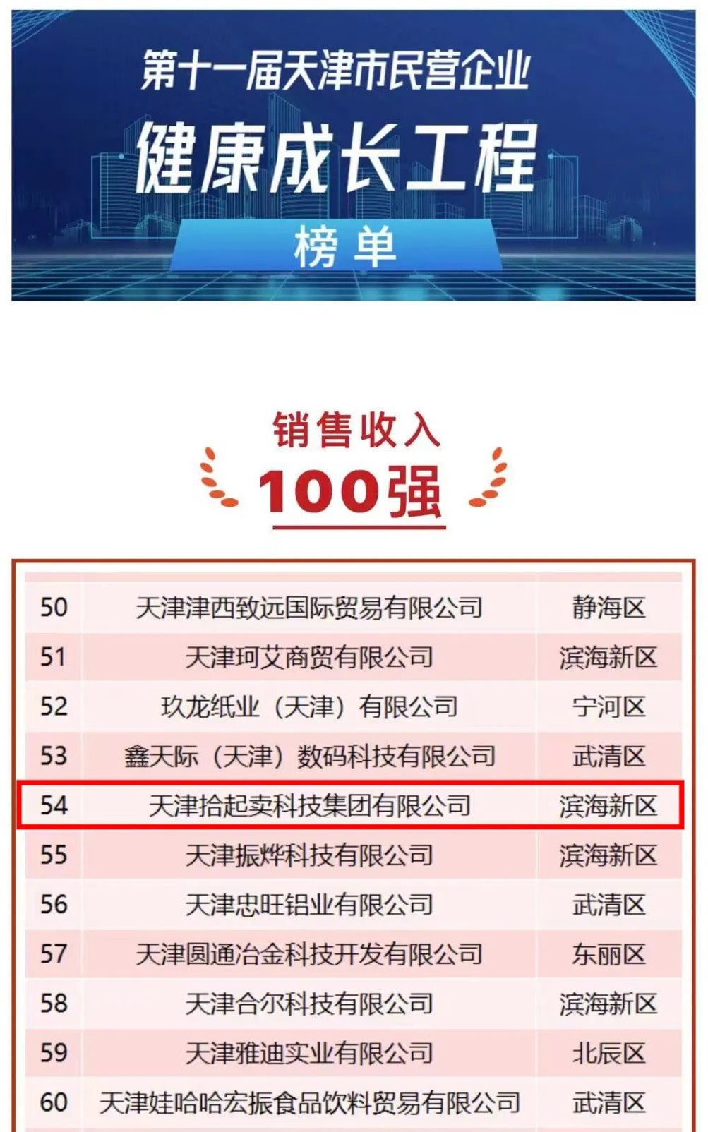 拾起卖上榜第十一届天津市民营企业“健康成长工程”百强榜单